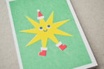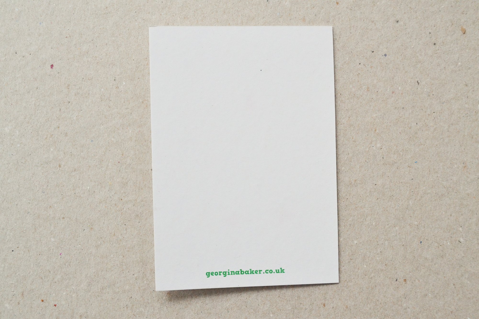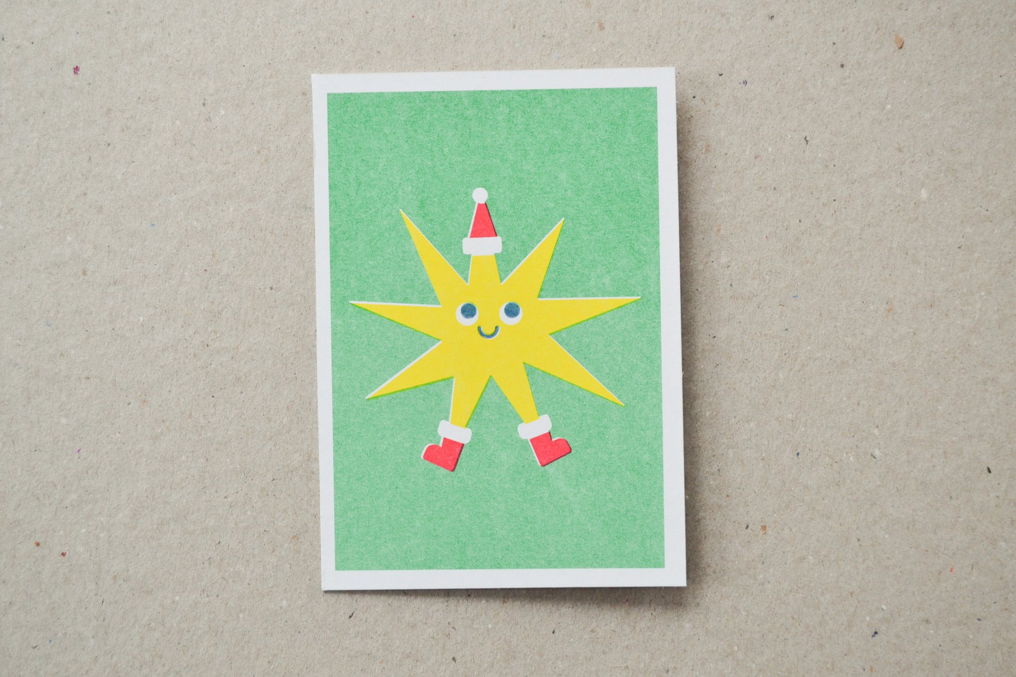 Design is an original riso print using yellow, red and green ink. Printed on Context Natural 300gsm paper.