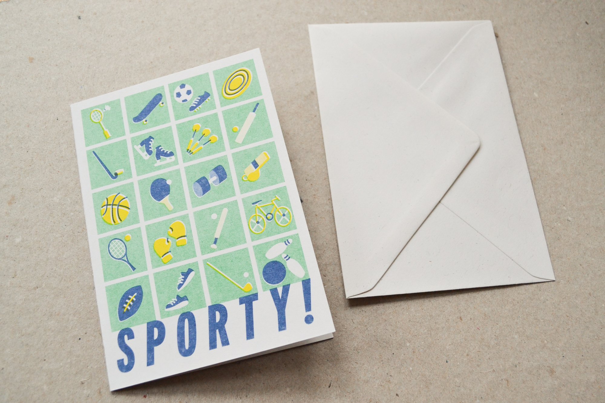 Design is an original riso print using yellow, federal blue and green ink. Printed on Context Natural 300gsm paper.